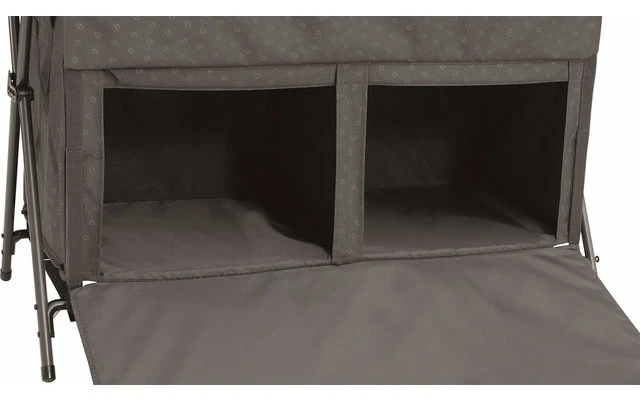 Der faltbare Campingschrank Aruba in Grau mit 4 Staufächern und 2 Netzfächern eignet sich hervorragend, um Campingzubehör zu verstauen. Die robuste, herunterklappbare Tür mit Griff bietet einen geräuscharmen nutzbaren Stauraum wie zu Hause. Die Tür ist mit einem Magentverschluss ausgestattet. An der Seite befindet sich zusätzlich noch ein praktischer Organizer und ein Haken um Dinge aufzuhängen. Der Campingschrank kann alleine oder zusammen mit dem Neat´n´Tidy Organiser verwendet werden. Inklusive Tragetasche für einfache Lagerung und Transport.